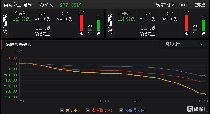 3月5日(ri),港股三大指数早盘走强午(wu)后持续回落,恒生指数一度涨至2%,最终小幅下跌(die)0.28%,国(guo)企指数、恒生科技指数离(li)别转跌(die)至0.38%及0.69%。值(zhi)得注意的是,南下资金净卖出港股277.35亿(yi)港元,为史上最大单日(ri)净卖出。