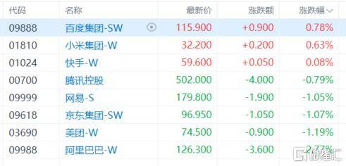 权重科技股涨跌(die)没有一,百度、小米、快(kuai)手微涨;阿里巴巴跌(die)超2%,网易、京东(dong)、美团跌(die)超1%,腾讯控股小幅下跌(die)。