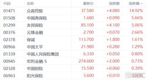 保险股涨幅居前,我国(guo)再保险涨超5%,友邦(bang)保险、云锋金融、保诚、我国(guo)平静、我国(guo)群(qun)众保险团体等跟涨。