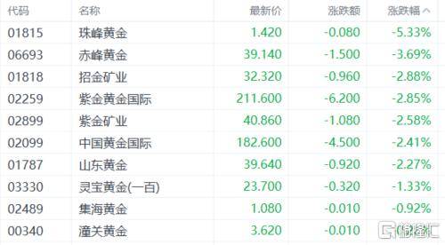 黄金股下挫,珠峰黄金跌(die)超5%,赤峰黄金、招金矿业、紫金黄金国(guo)际、紫金矿业、我国(guo)黄金国(guo)际、山东(dong)黄金等跟跌(die)。
