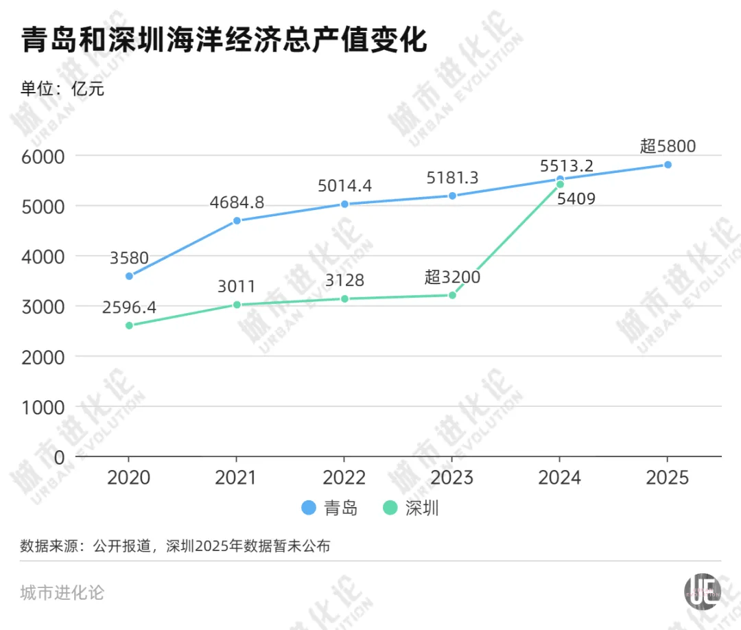 数据(ju)显示,2020年,青岛、深(shen)圳海洋经(jing)济生产总值分别为(wei)3580亿元(yuan)、2596.4亿元(yuan),青岛远超深(shen)圳近1000亿元(yuan);到(dao)2024年,两市海洋经(jing)济生产总值分别增至5513.2亿元(yuan)、5409亿元(yuan),短短四年间,青岛领(ling)先优势大(da)幅收窄(zhai)至仅100亿元(yuan)左右。