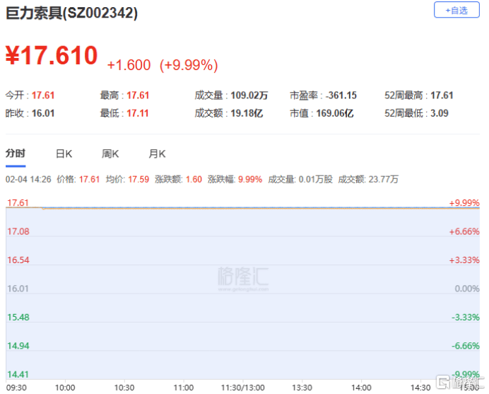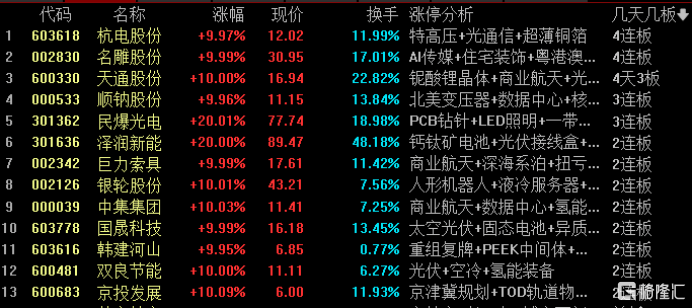 杭电股份(fen)、名(ming)雕股份(fen)4连板,天通股份(fen)4天3板,顺钠股份(fen)、民爆光电3连板,泽润新能、巨力索具(ju)、银(yin)轮(lun)股份(fen)、中集团体、国晟(cheng)科技(ji)、韩建河山、双(shuang)良节能、京投发展2连板。