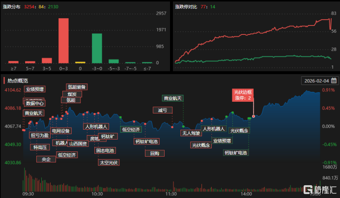 2月4日,A股三大(da)指数本日涨跌没有(you)一,停止收盘,沪指涨0.85%,深证成(cheng)指涨0.21%,创业板指跌0.4%。