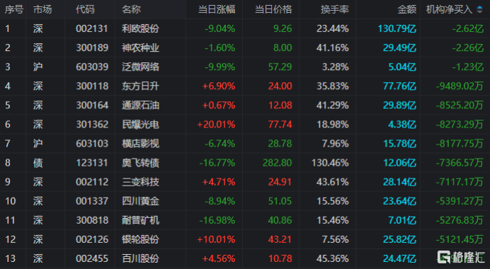 龙虎榜中涉及机构专用席位的个股中,单日净卖出额前三为利欧股份(fen)、神农种业、泛微网络,分别为2.62亿、2.26亿、1.23亿。